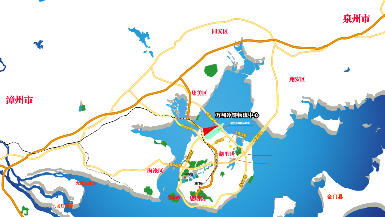 厦门万翔冷链物流中心位于福建厦门本岛北端航空港工业与物流园区内,东接集美大桥,南邻厦门机场,西接铁路北站、象屿保税区和东渡港区,北接厦门大桥和杏林大桥,处于海、陆、空立体交通运输方式的结点,集散条件便捷,交通网络四通八达。